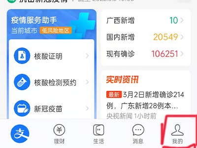 1、打开支付宝,点击右下角“我的”,进入“我的”页面。