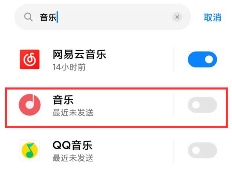 3、搜索“音乐”应用,把音乐应用的通知权限关闭即可。