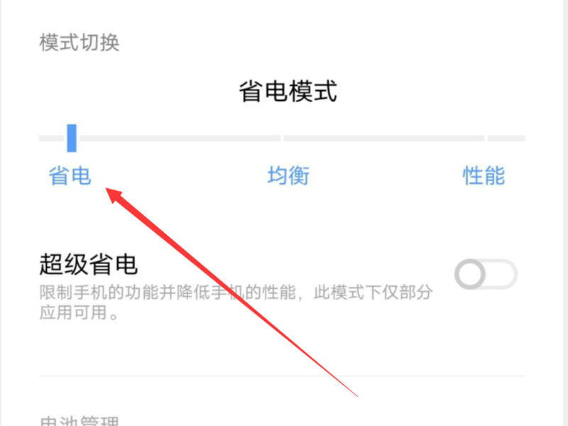 2、在模式切换栏目下,把模式拉到左边的“省电”模式即可。