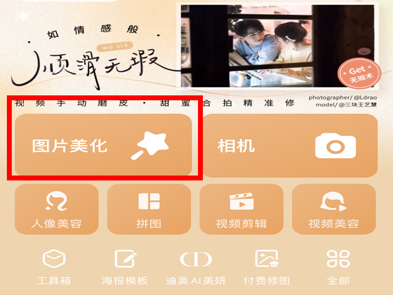 1、打开美图秀秀,点击“图片美化”,选择进行p图的照片,进入图片编辑界面。