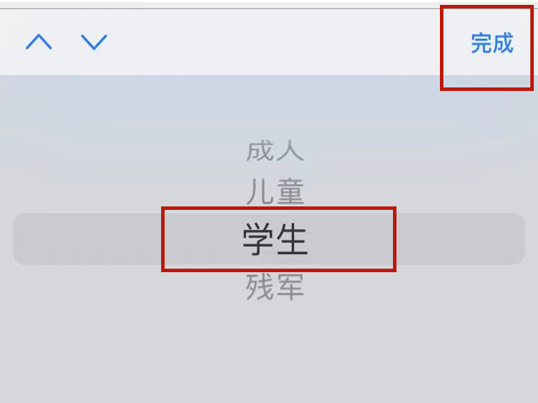 4、选择“学生”再点击“完成”填写相关信息即可绑定学生证买票。