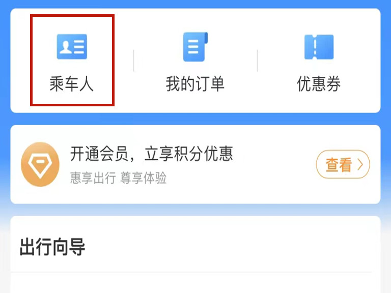 1、打开铁路12306.切换到个人中心,点击“乘车人”进入乘车人页面。