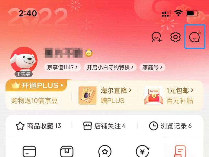 1、进入京东app,进入首页后选择右下角“我的”,点击右上角的聊天气泡,进入聊天界面。