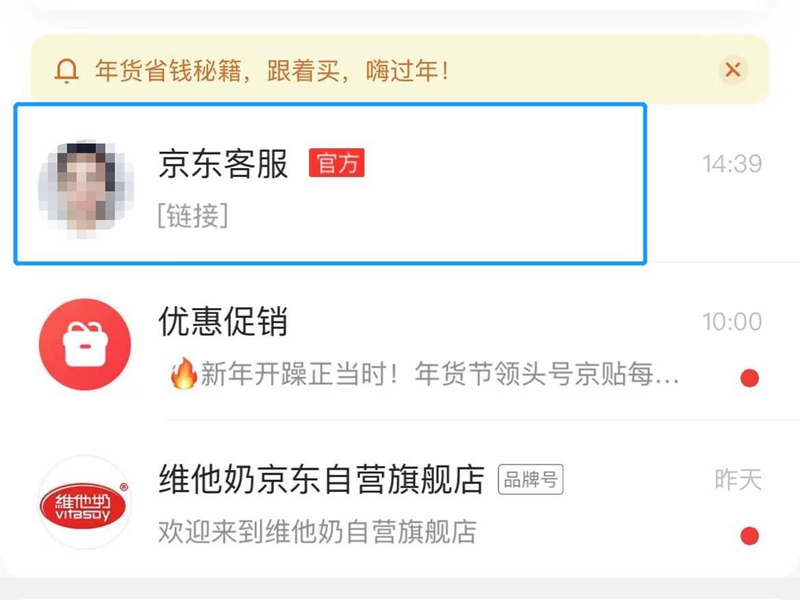 2、在聊天列表中找到“京东客服”,进入聊天页面。