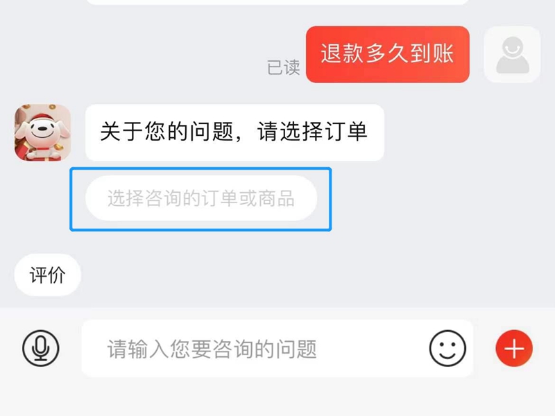 3、提问“退款多久到账”后,点击下方的“选择咨询的订单或商品”进行咨询即可。