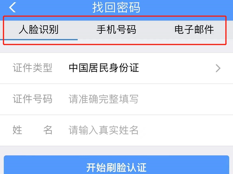 3、选择找回方式,可选择人脸识别、手机号码、电子邮件三种方式找回密码,填写完整资料即可重置密码。