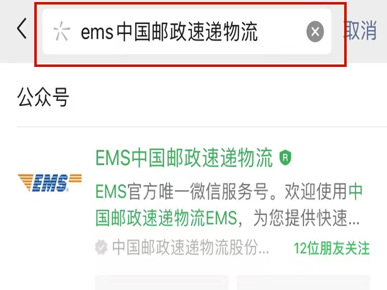 2、点击“+”进行搜索“EMS中国邮政速递物流”进行关注。