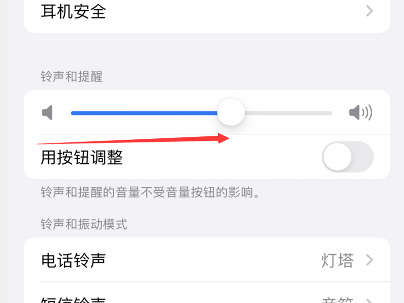 2、把“铃声和提醒”下方的调节条向右拉大声音即可开启拍照的咔嚓声。