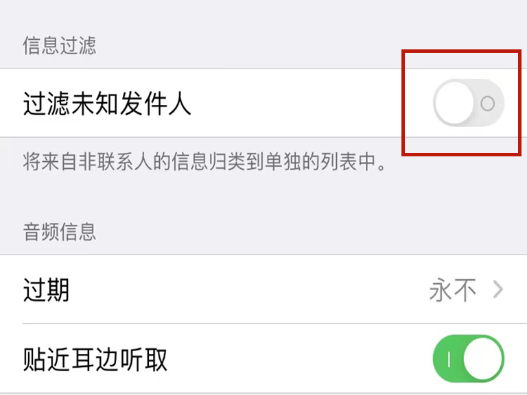 2、点击“过滤未知发件人”即可屏蔽黄色垃圾短信。