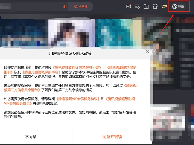 1、打开腾讯视频,点击屏幕右上角的“登录”,选择“同意并继续”。