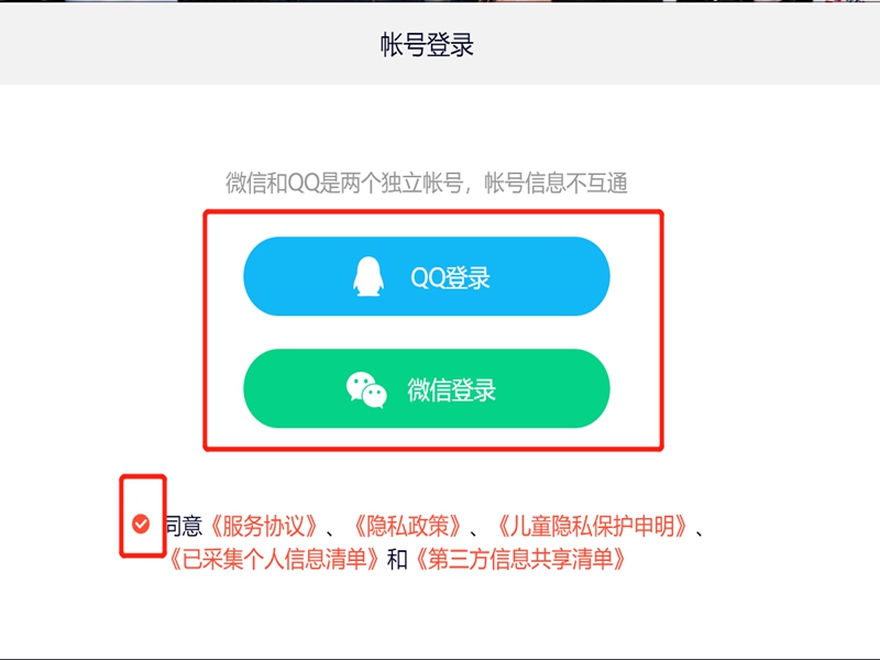 2、选择已开通的腾讯视频会员账号对应的登陆平台,勾选同意《服务协议》等。