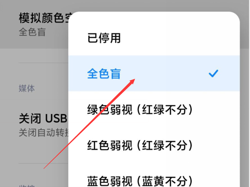 3、进入“模拟颜色空间”,勾选“全色盲”选项即可。