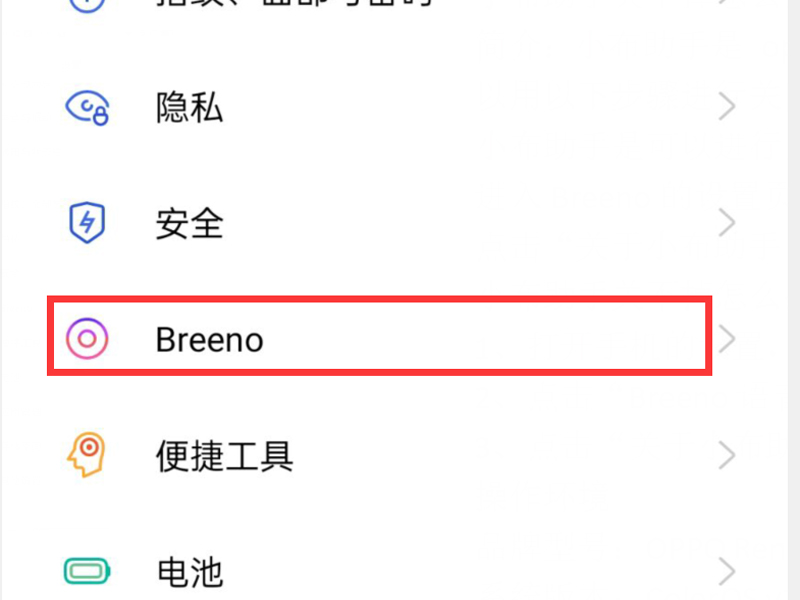1、打开手机的设置,点击“Breeno”按钮,进入Breeno的设置页面。
