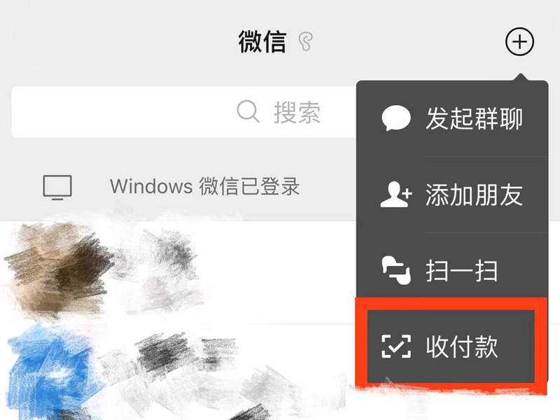 1、在“微信”页面中点击右上角“+”,选择“收付款”选项。