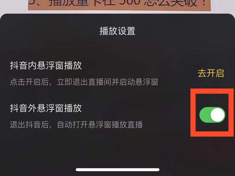 3、打开“抖音外悬浮窗播放”按钮即可。