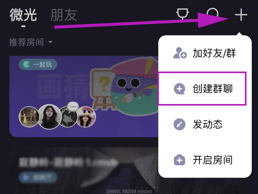1、打开微光,点击右上角的“+”号图标,然后点击开启房间。