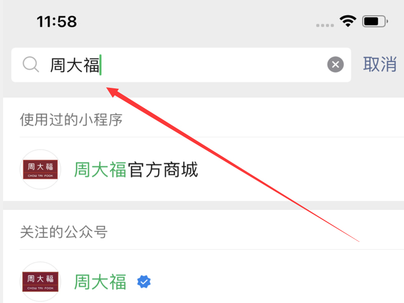 2、在上方的搜索框中输入“周大福”,进入周大福的微信公众号中。