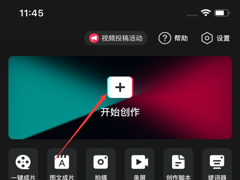 1、打开剪映app,在“剪辑”页面中点击上方的“开始创作”按钮。