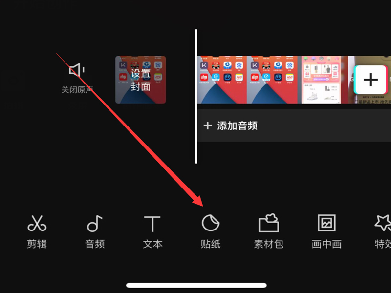 2、添加素材后进入创作页面,点击下方的“贴纸”按钮,添加一个贴纸。