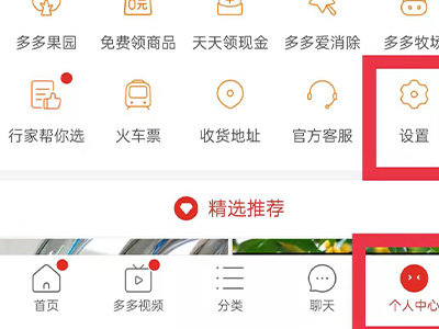 1、打开拼多多,切换至“个人中心”页面,点击设置。