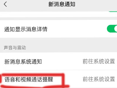 3、在新消息通知页面点击“语音和视频通话提醒”。