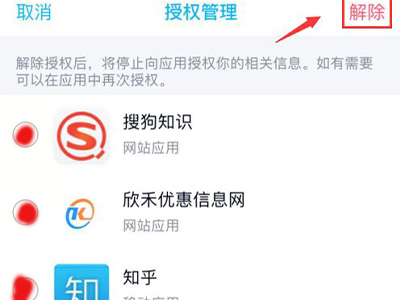4、点击右上角管理,勾选解除授权的软件,点击右上角“解除”。