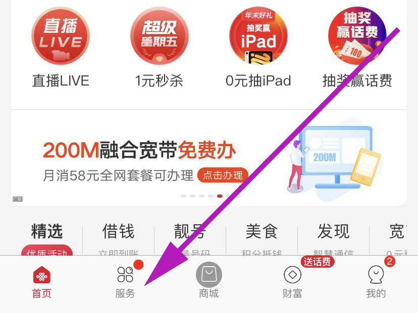 1、打开中国联通,然后在下方图标中,选择“服务”。