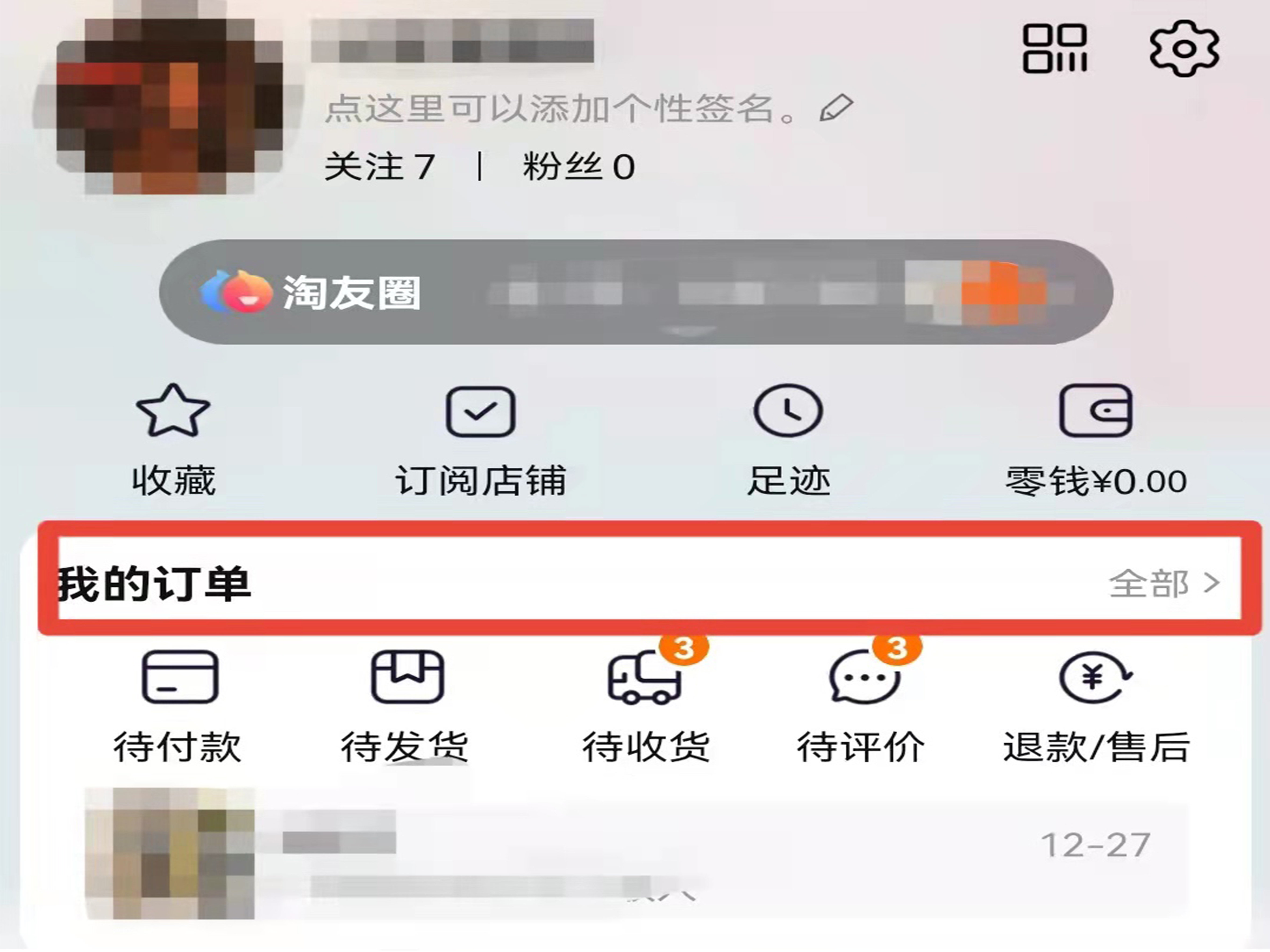 2、点击“我的订单”右侧的“全部”,选择商品订单。