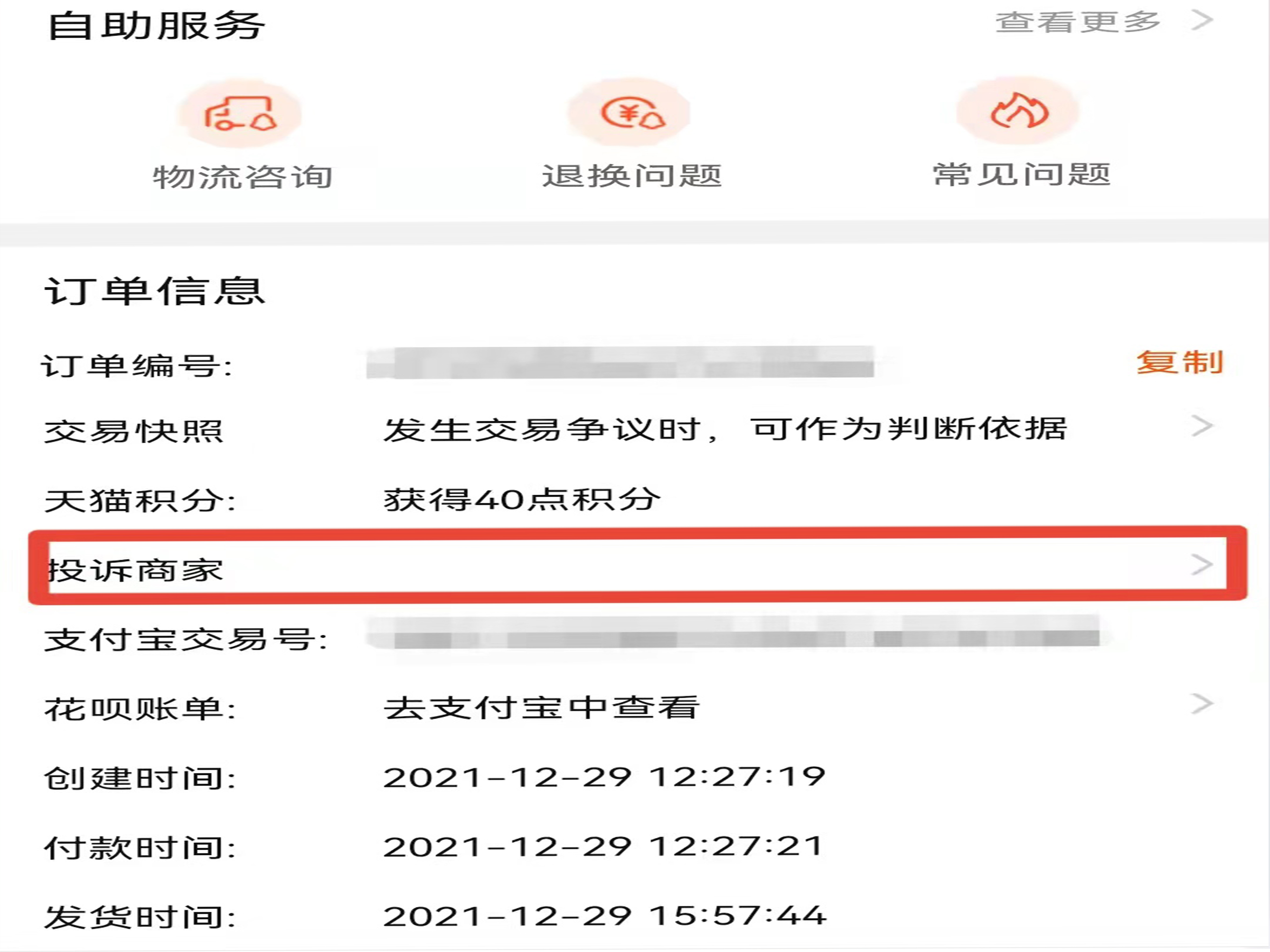 3、进入订单主页面,点击订单信息栏的“投诉商家”。