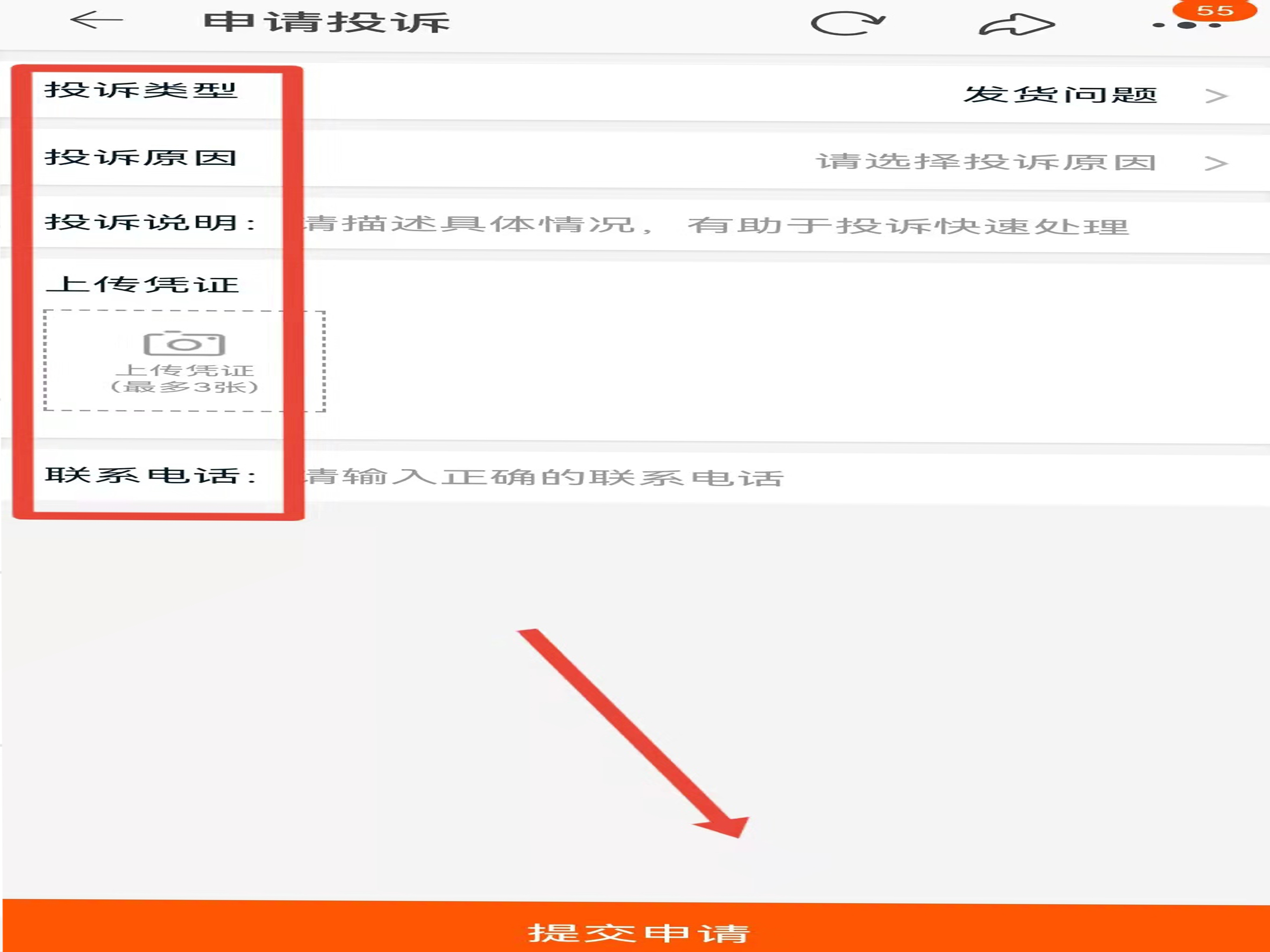 5、选择“投诉原因”、上传凭证、输入正确的联系电话,点击“提交申请”即可。