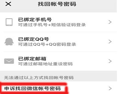 2、在找回密码页面点击申诉找回微信账号密码。