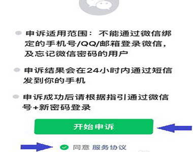 3、点击“同意服务协议”,点击“开始申诉”。