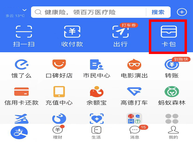 1、打开支付宝,进入“首页”界面,再点击上方的“卡包”。