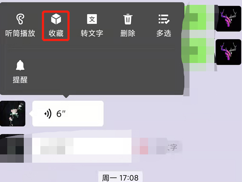 2、进入聊天界面后,选择一条语音消息,长按并收藏。