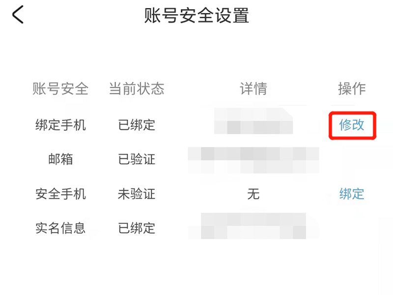 4、进入账号安全设置界面后,点击绑定手机右边的修改。