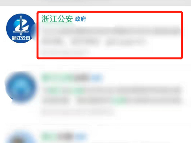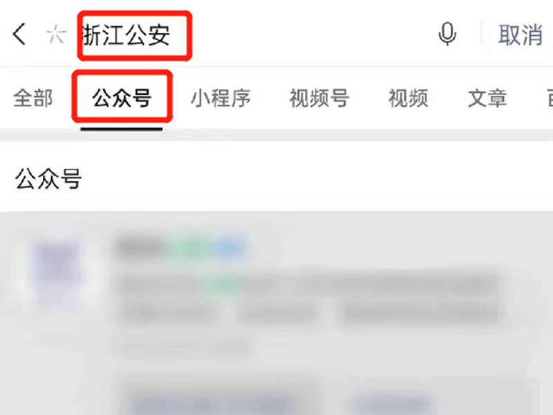 2、输入“浙江公安”进行搜索,得出结果后点击“公众号”,找到并点击“浙江公安”公众号。