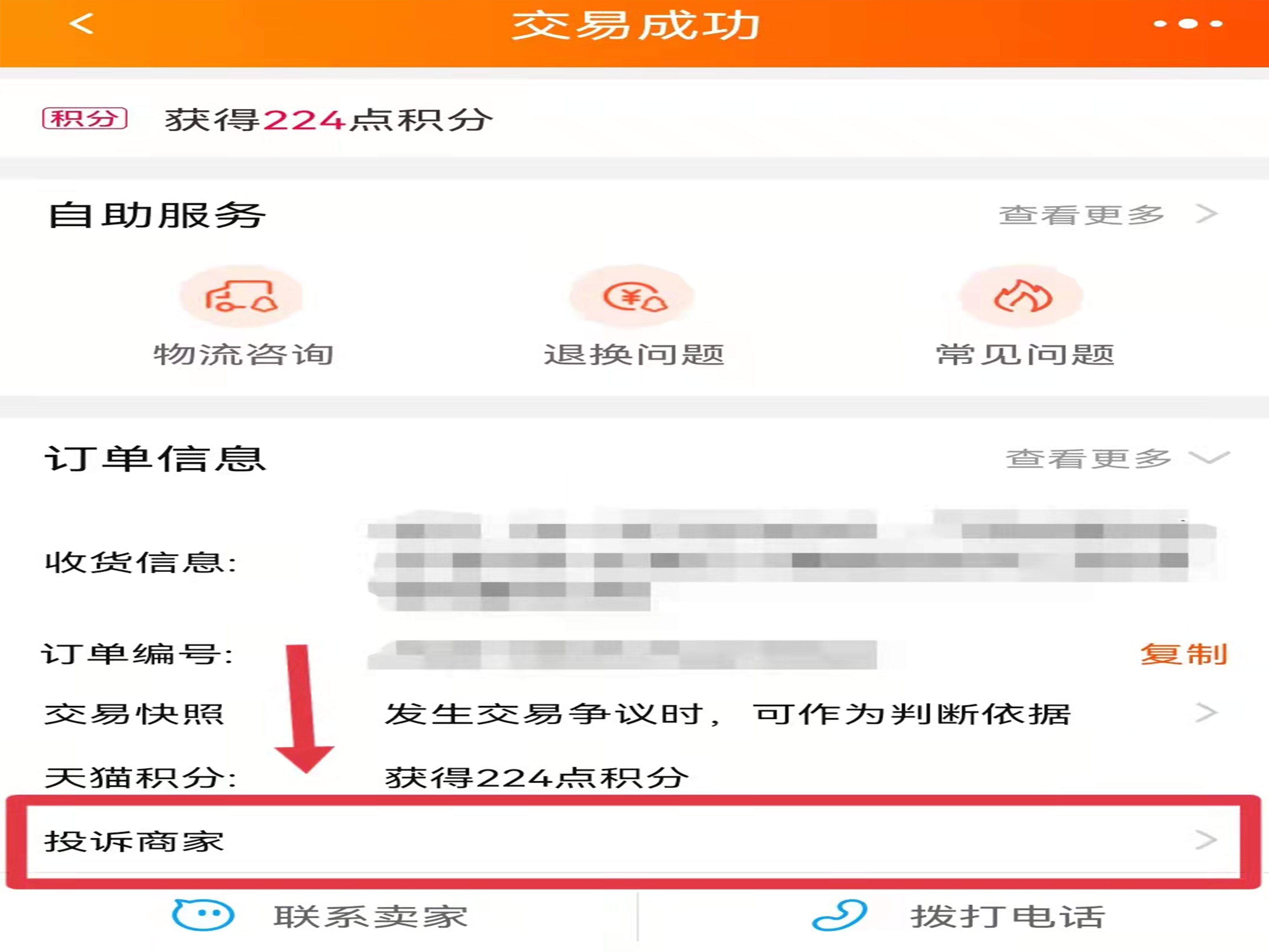 3、进入订单主页面,点击订单信息栏的“投诉商家”。