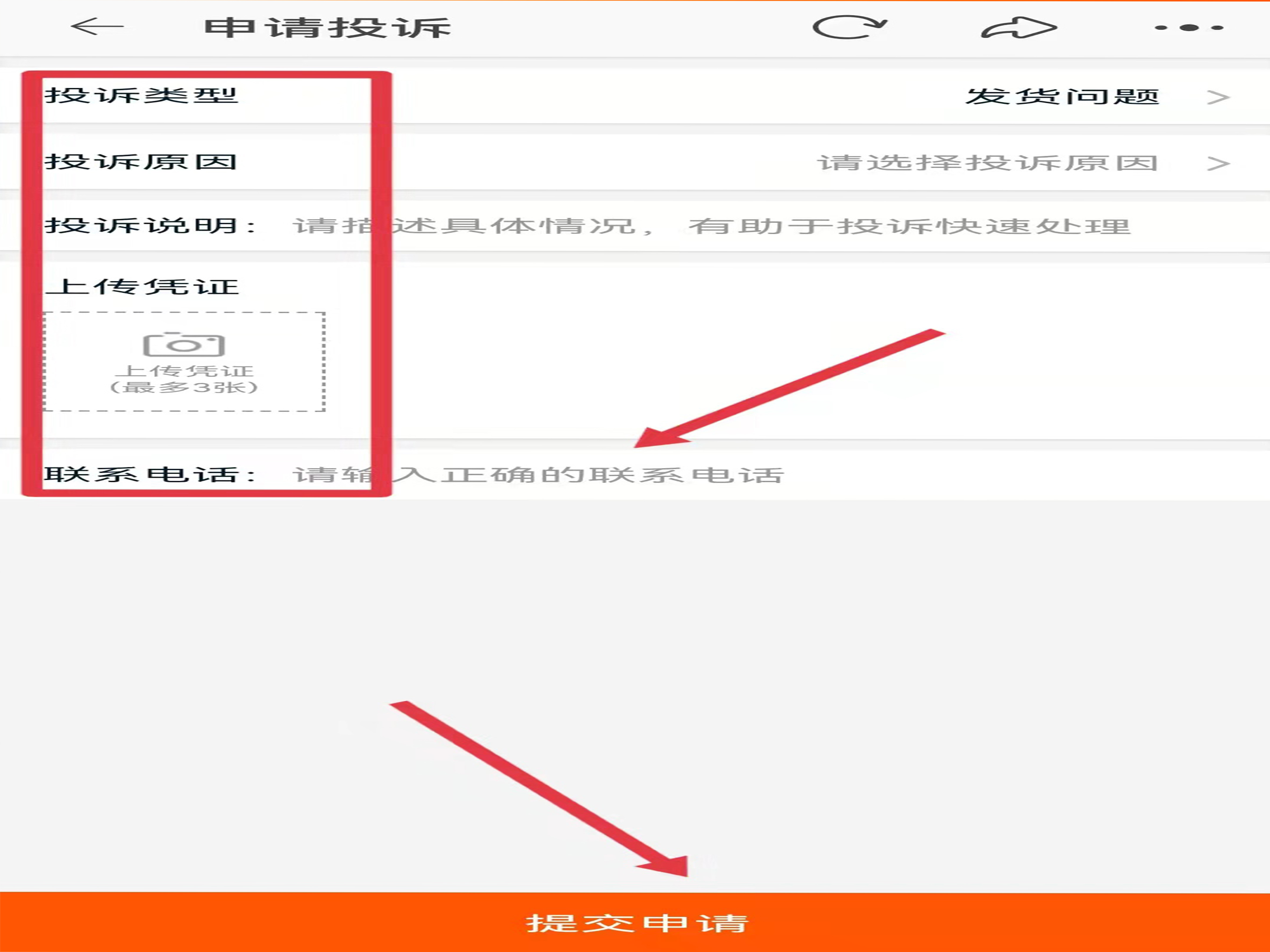 5、选择“投诉原因”、上传凭证、输入正确的联系电话,点击“提交申请”即可。