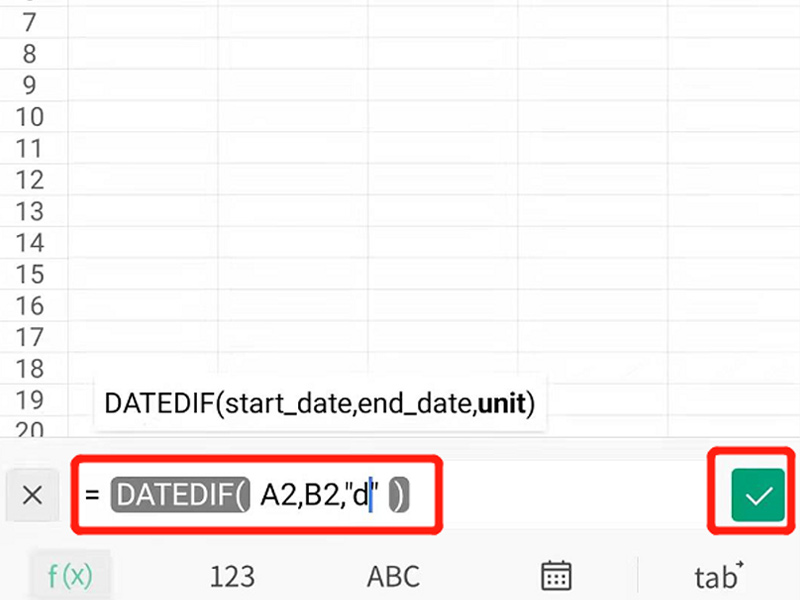 5、在函数后的括号内输入【A2,B2,"d"】,点击勾号,即可计算出天数。