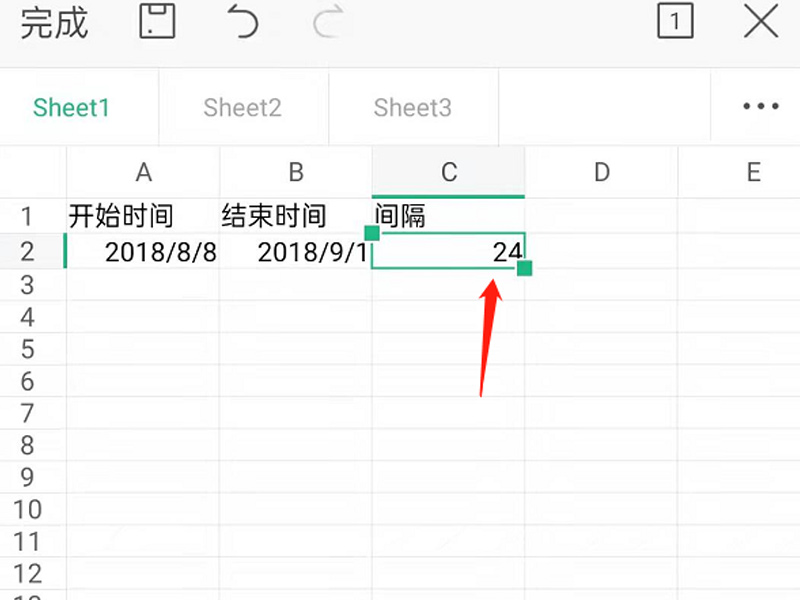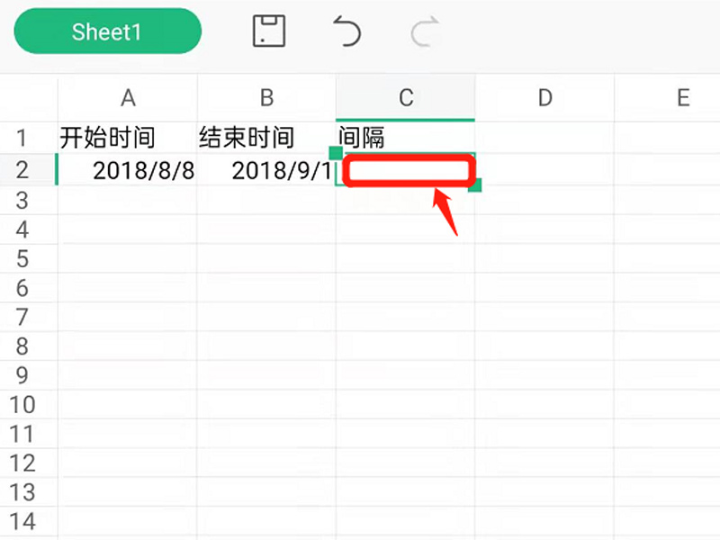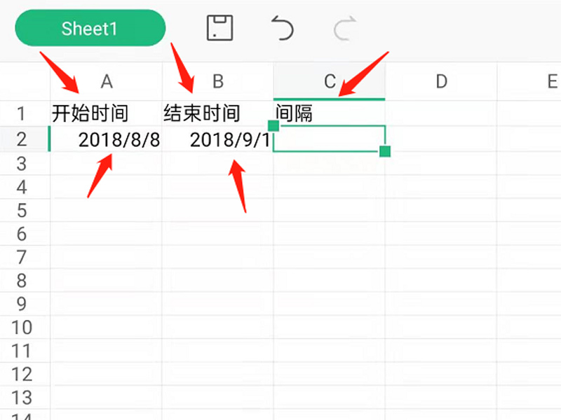 2、在表格A1区域输入“开始时间”,B1输入“结束时间”,C1为“间隔”,在A2、B2输入日期。