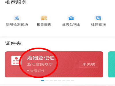 4、电子结婚证在证件夹模块中,如果之前没有领取,点击关联一下,以后便随时可以查询。