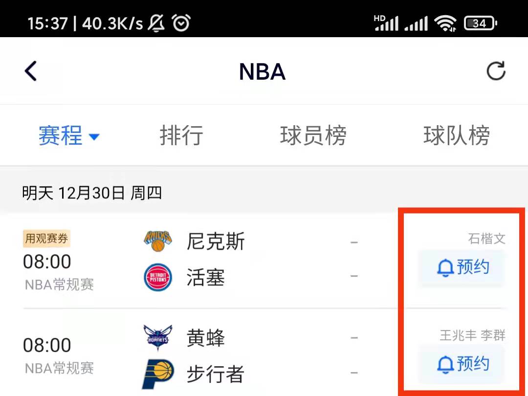 3、如果当前有NBA直播,直接点击赛事即可观看直播,若当前没有直播,可以先点击“预约”,到时间再来观看。