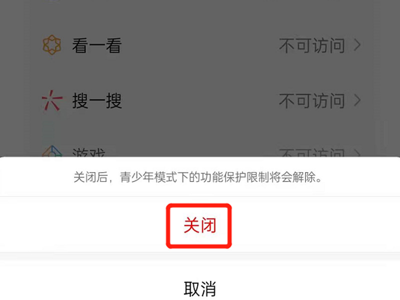 4、点击“关闭青少年模式”,再点击“关闭”,输入密码通过验证即可关闭青少年模式。