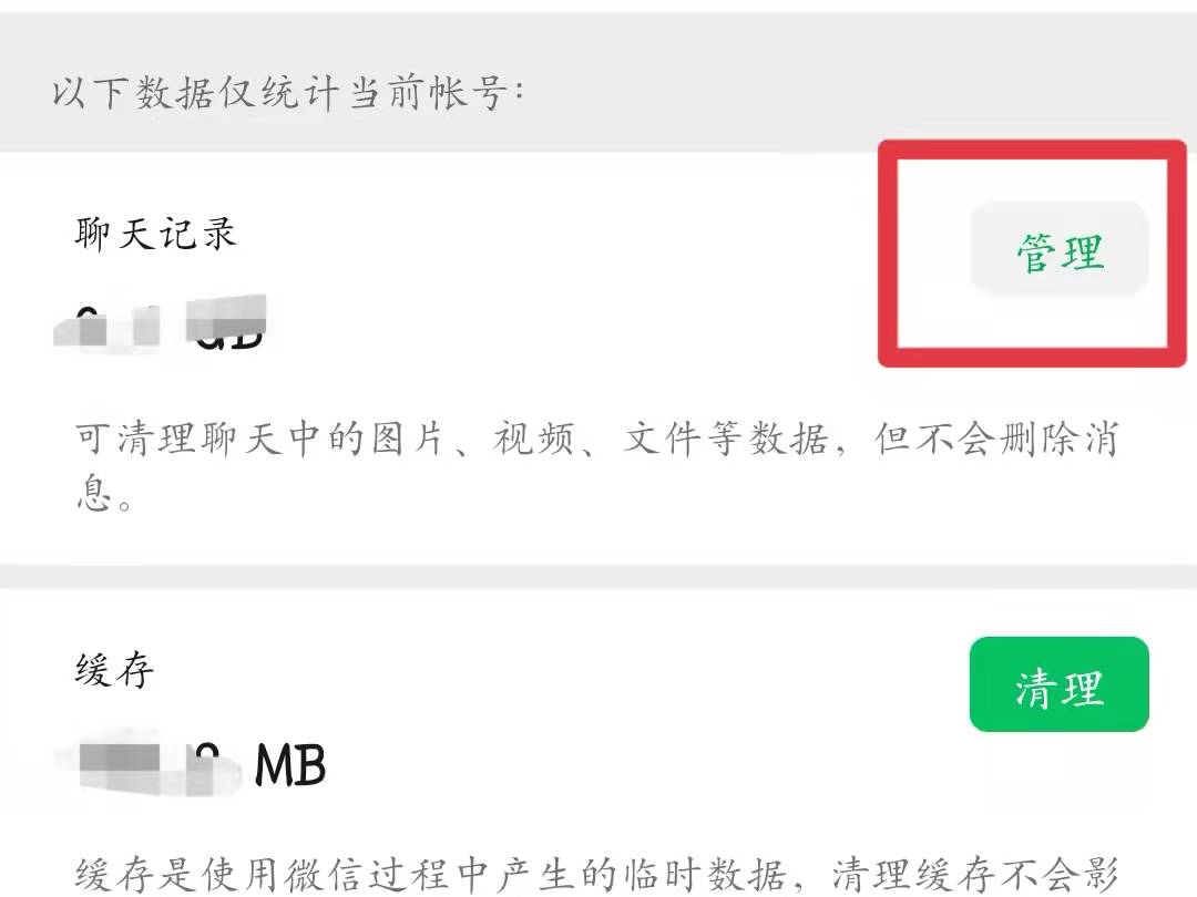 2、点击“微信存储空间”按钮,再点击聊天记录后方的“管理”,进入好友存储空间界面。