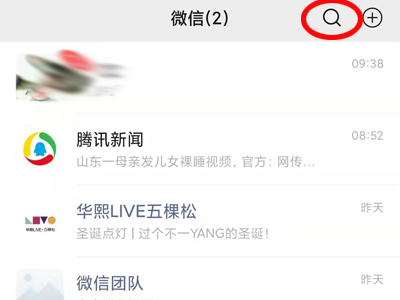 1、打开微信,切换到“微信”,点击右上角的放大镜。