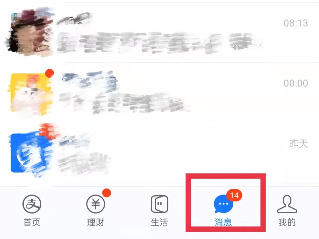 1、打开支付宝,点击下方的消息,打开好友聊天界面。