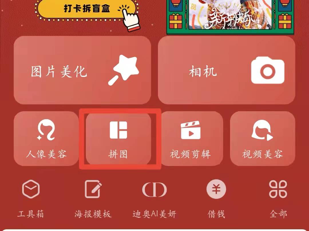 1、打开美图秀秀APP,点击首页中的“拼图”按钮,进入图片选择界面。