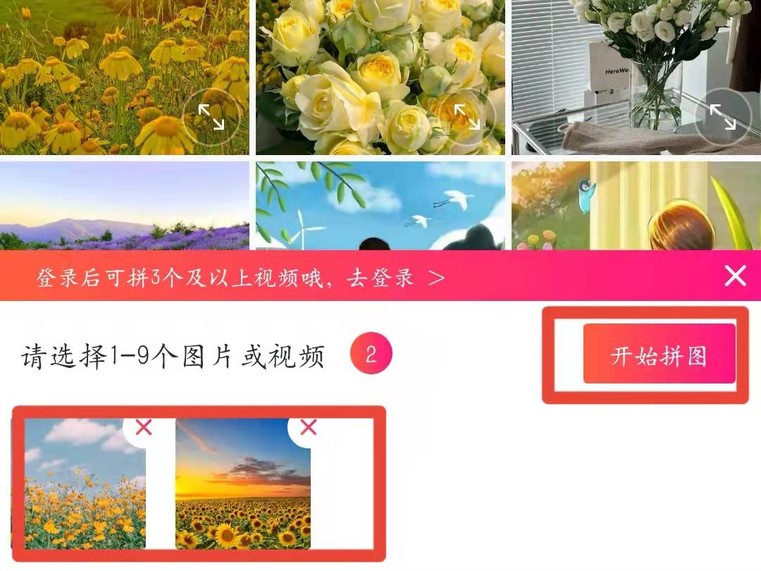 2、选择两张图片,点击“开始拼图”,进入拼图界面。