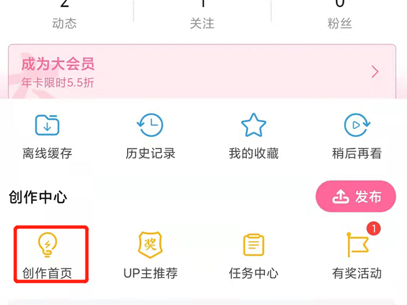 1、打开哔哩哔哩app,点击右下方的“我的”,再点击创作首页。