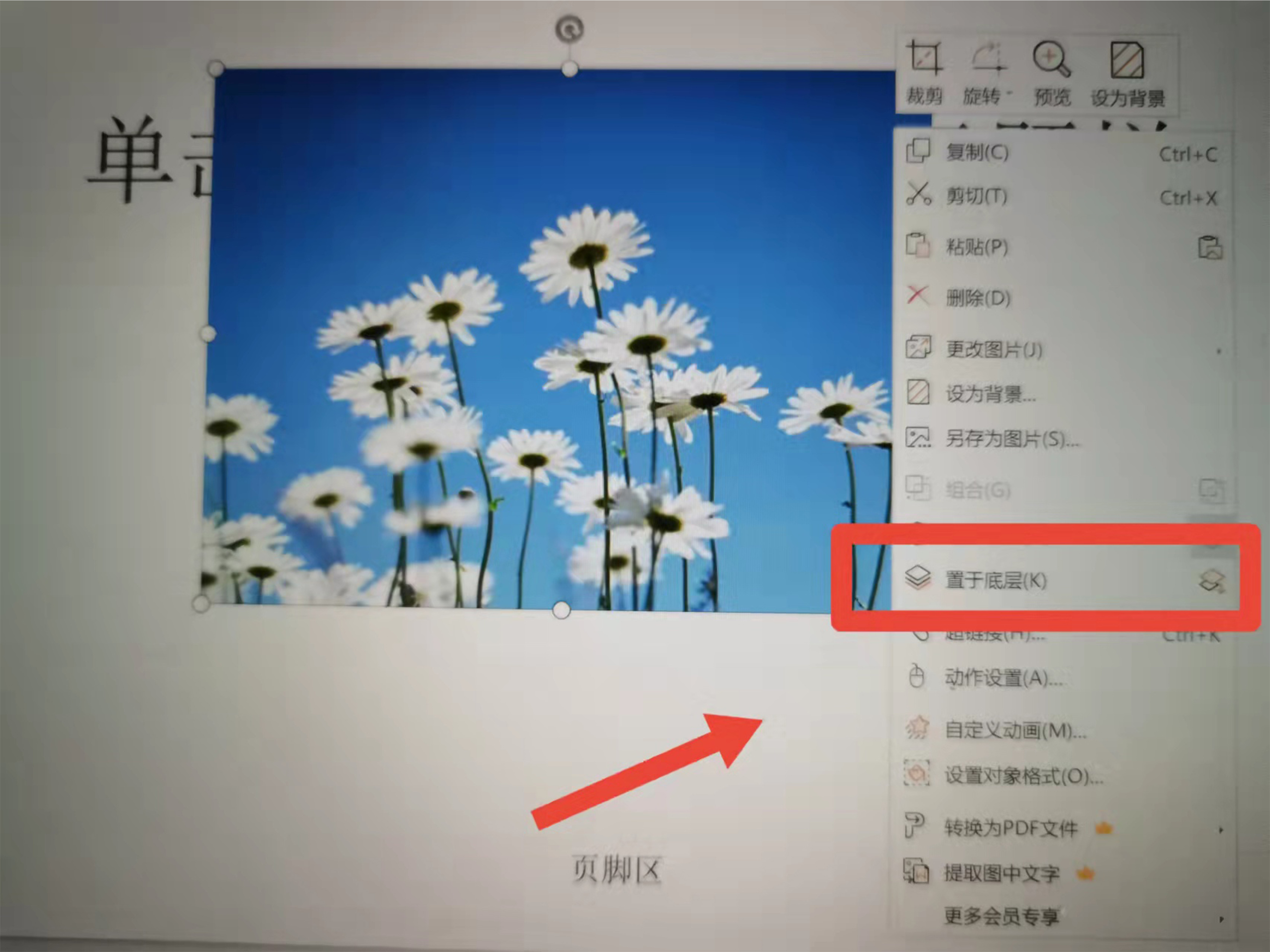 4、调整图片大小,选中图片右击鼠标,选择“置于底层”。